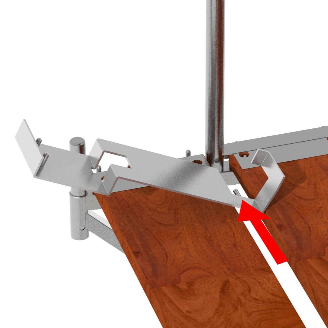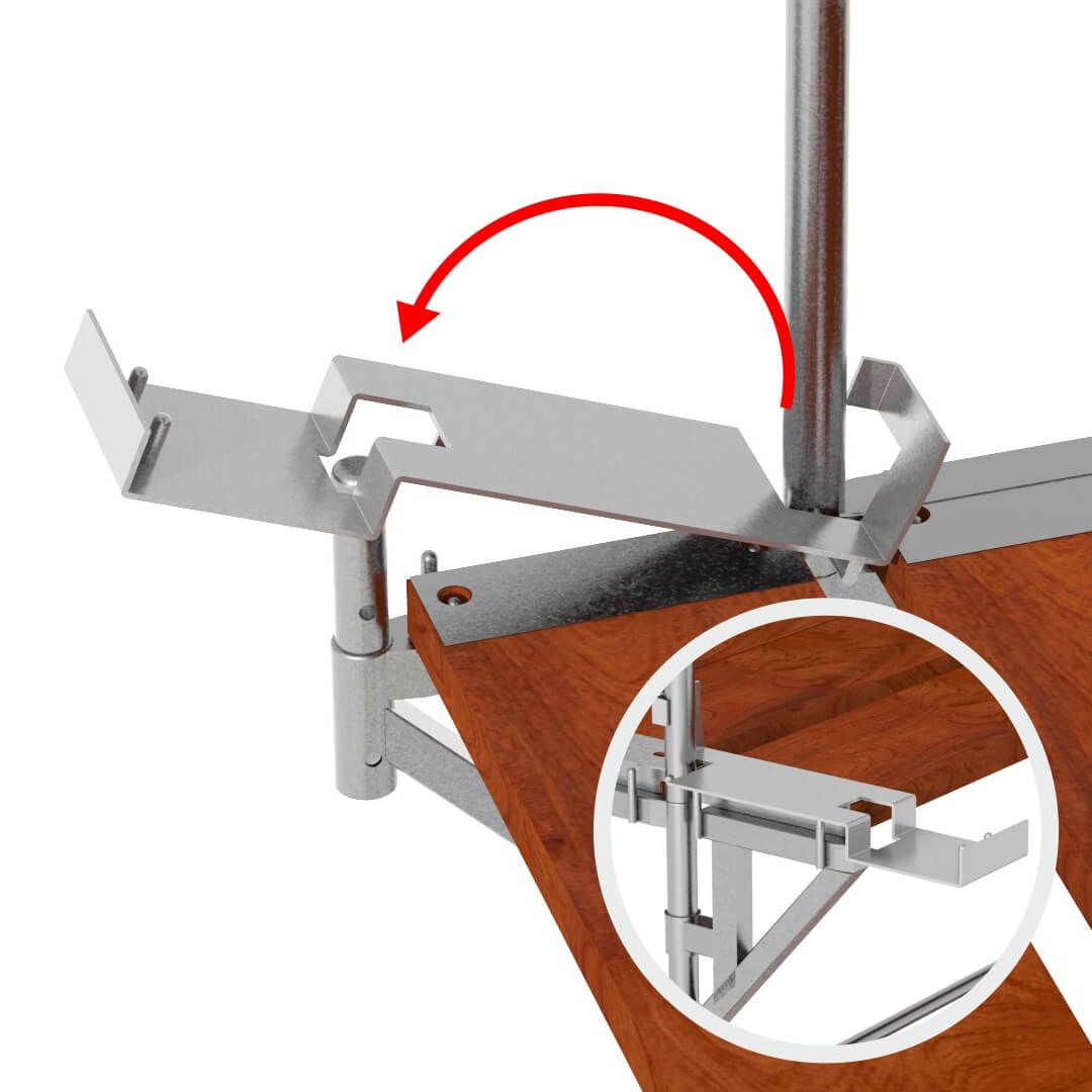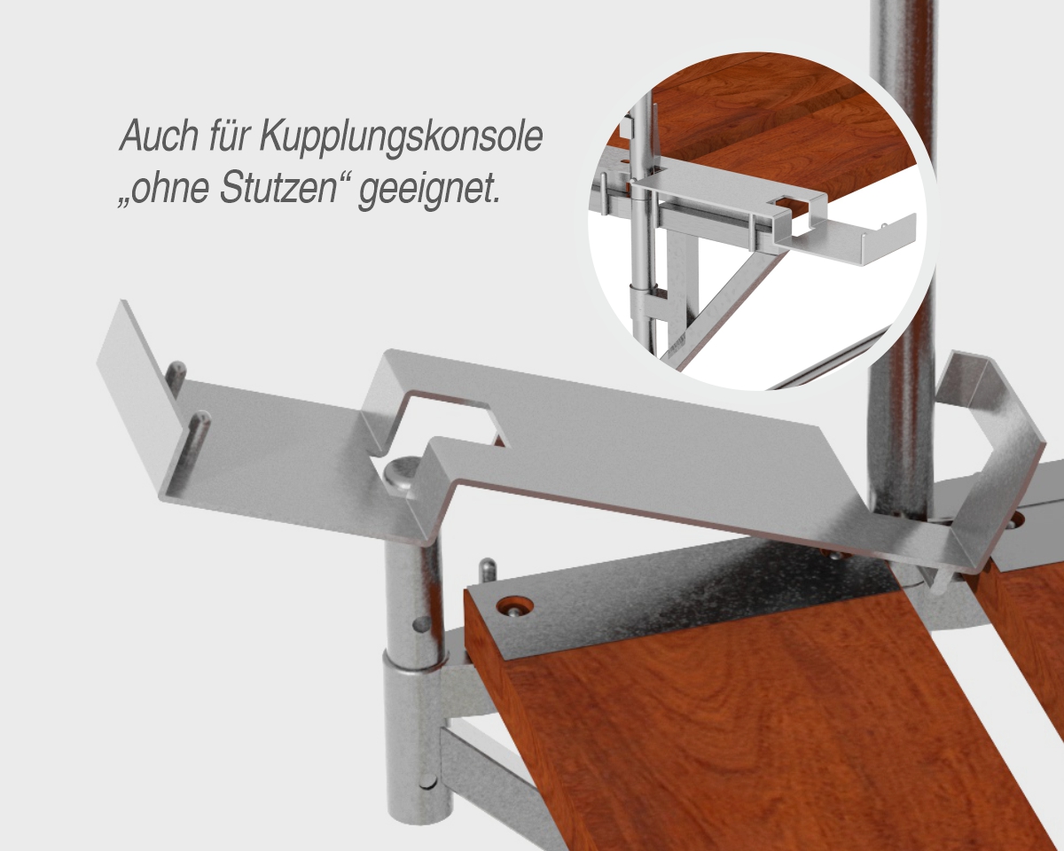 Drehen Sie die Erweiterungskonsole über den Stutzen bis sie auf der Gerüstbohle aufliegt (Auch für Kupplungskonsole „ohne Stutzen“ geeignet.)
