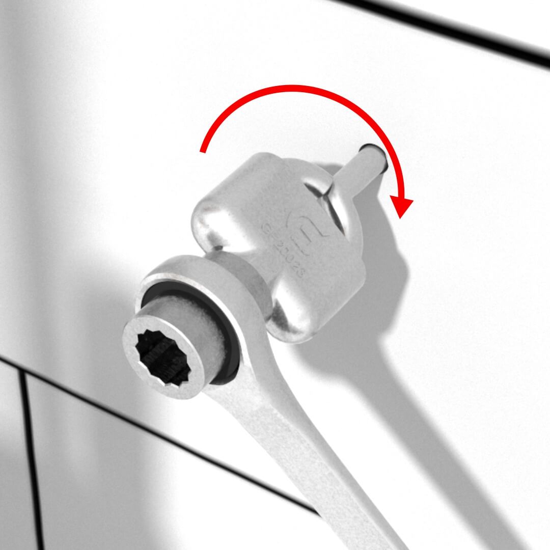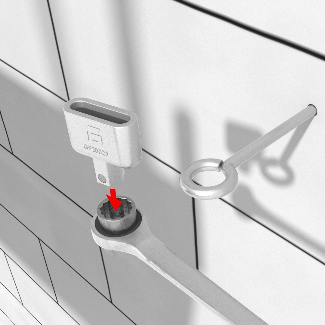 Die Ringösennuss ist ein handlicher Werkzeug-Aufsatz, das an eine Gerüstbauratsche magnetisch befestigt wird. Auf der anderen Seite befindet sich eine Schlitz-Loch-Aufnahme, die perfekt auf Ring-ösenschrauben abgestimmt ist.